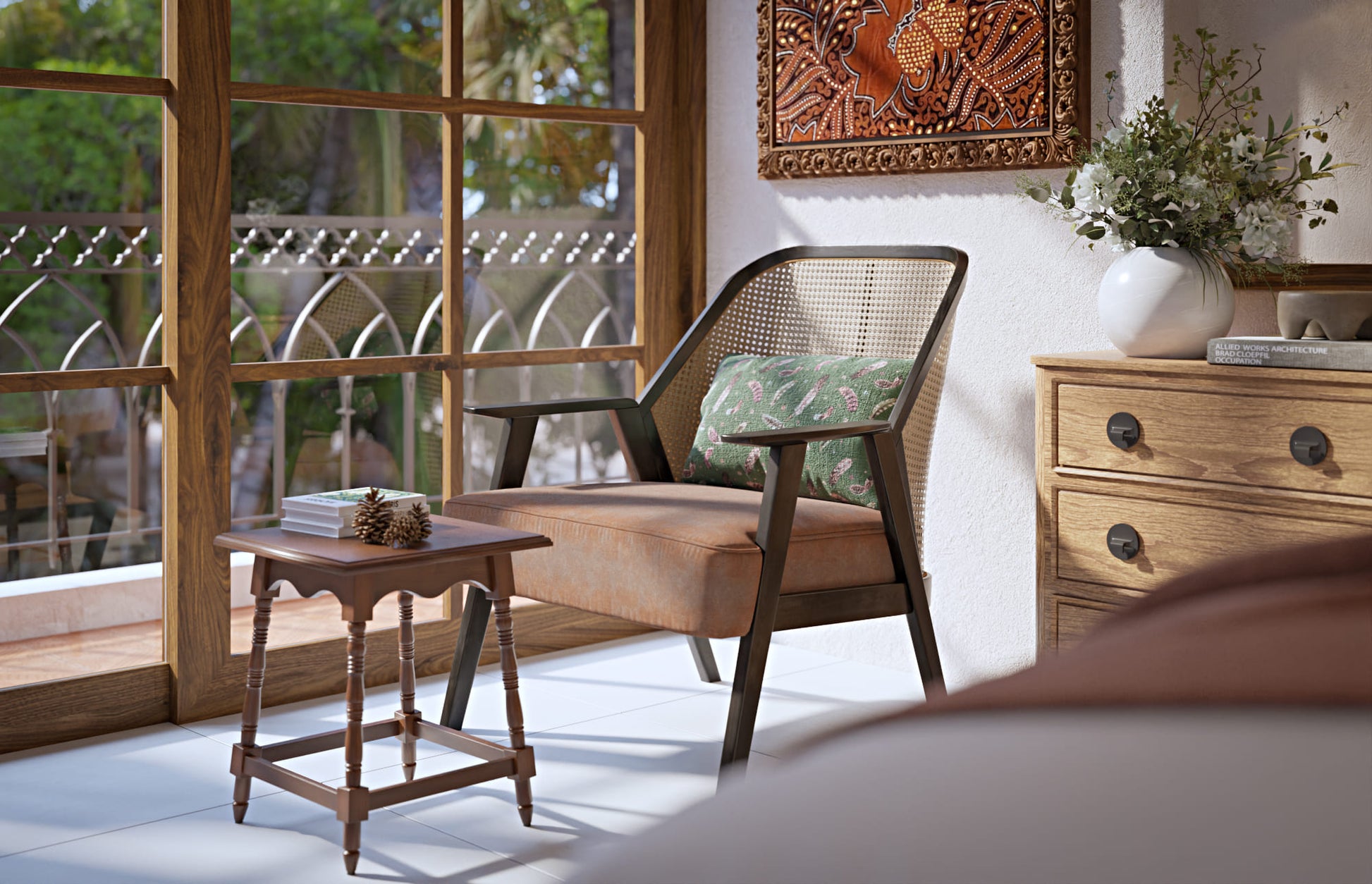 - Kulturní detaily s batikem a dřevěnými řezbami